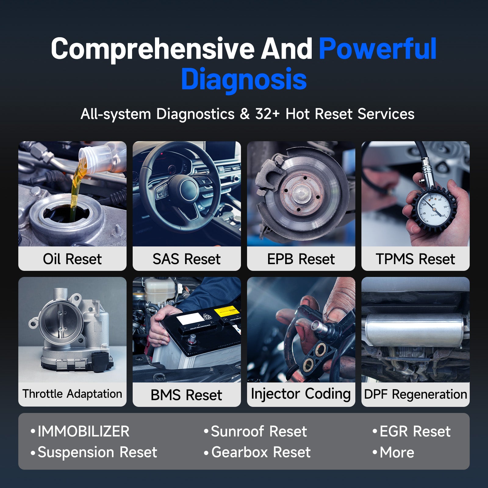 • Ergänzen Sie die OE-Level-Vollsystemdiagnosen, um alle Fahrzeugsysteme zu scannen, einschließlich Motor, Getriebe, Airbag, ABS, Wegfahrsperre, Gateway, Lenkung und mehr. Erkennen Sie Fehler bei über 110 Automarken für eine bessere Fehlersuche und komplexe Reparaturen.