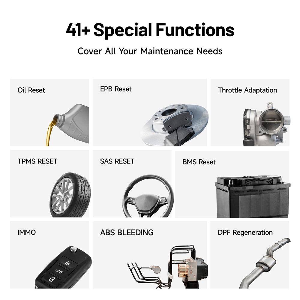 • Mit Zugang zu über 41 wesentlichen Rücksetzdiensten sind Sie in der Lage, alle Wartungsaufgaben mühelos zu bewältigen. Von routinemäßigen Verfahren wie Öl- und SAS-Rücksetzungen bis hin zu spezialisierten Funktionen wie Drosselklappenanpassung und Kalibrierung ermöglichen Ihnen diese Werkzeuge, außergewöhnlichen Service mit Leichtigkeit zu bieten.