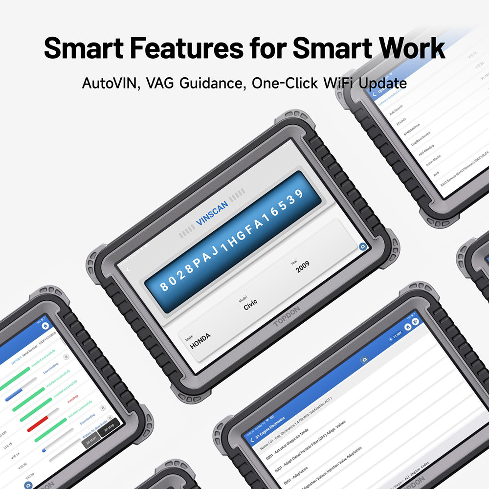 • Die Smart AutoVIN-Technologie vereinfacht die Fahrzeugidentifikation, während die VAG-geführten Funktionen Schritt-für-Schritt-Anleitungen bieten, um Ihren Arbeitsablauf effizienter zu gestalten. Mit einem Klick auf WiFi-Updates bleiben Sie immer auf dem neuesten Stand der Entwicklungen.