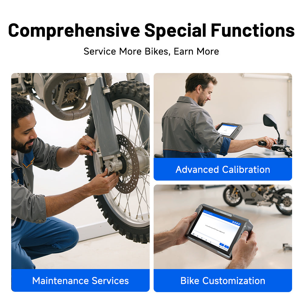 Nehmen Sie präzise Einstellungen mit fortschrittlichen Kalibrierungswerkzeugen für Tempomat, Leerlaufdrehzahl, Winkelsensoren und mehr vor. Stellen Sie Motorräder wieder her, um ein sanfteres und sichereres Fahrerlebnis zu bieten – und heben Sie Ihre Werkstatt mit Dienstleistungen hervor, die über Standardreparaturen hinausgehen. (*Spezialfunktionen variieren je nach Marke, Modell und Baujahr des Motorrads.)