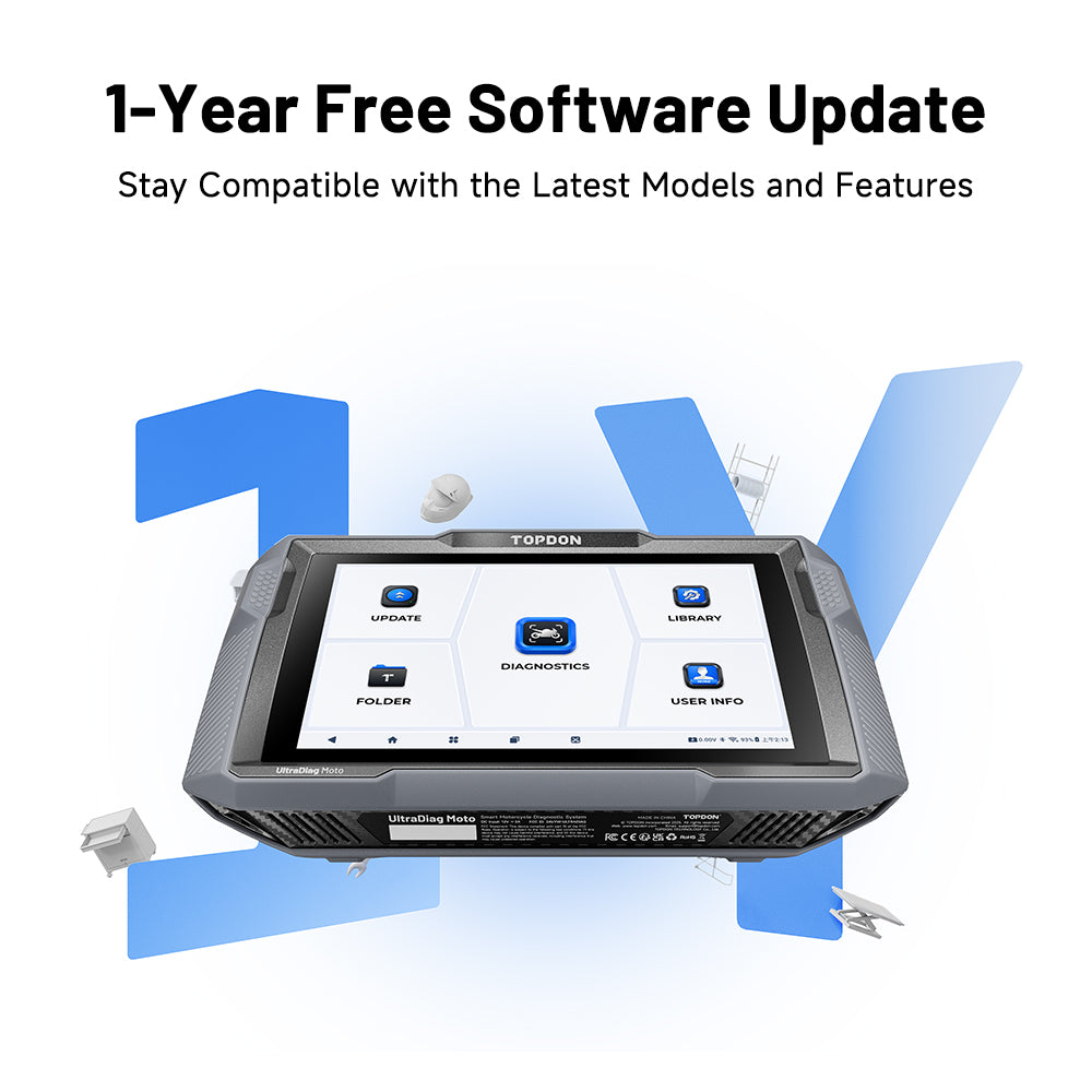 - Genießen Sie ein ganzes Jahr lang kostenlose Software-Updates, damit Ihr UltraDiag Moto mit den neuesten Motorradmodellen und erweiterten Diagnosefunktionen kompatibel bleibt. Dank der Ein-Klick-WiFi-Funktionalität verläuft der Upgrade-Prozess nahtlos, sodass Sie Reparaturherausforderungen meistern und Ihre Investitionsrendite maximieren können.